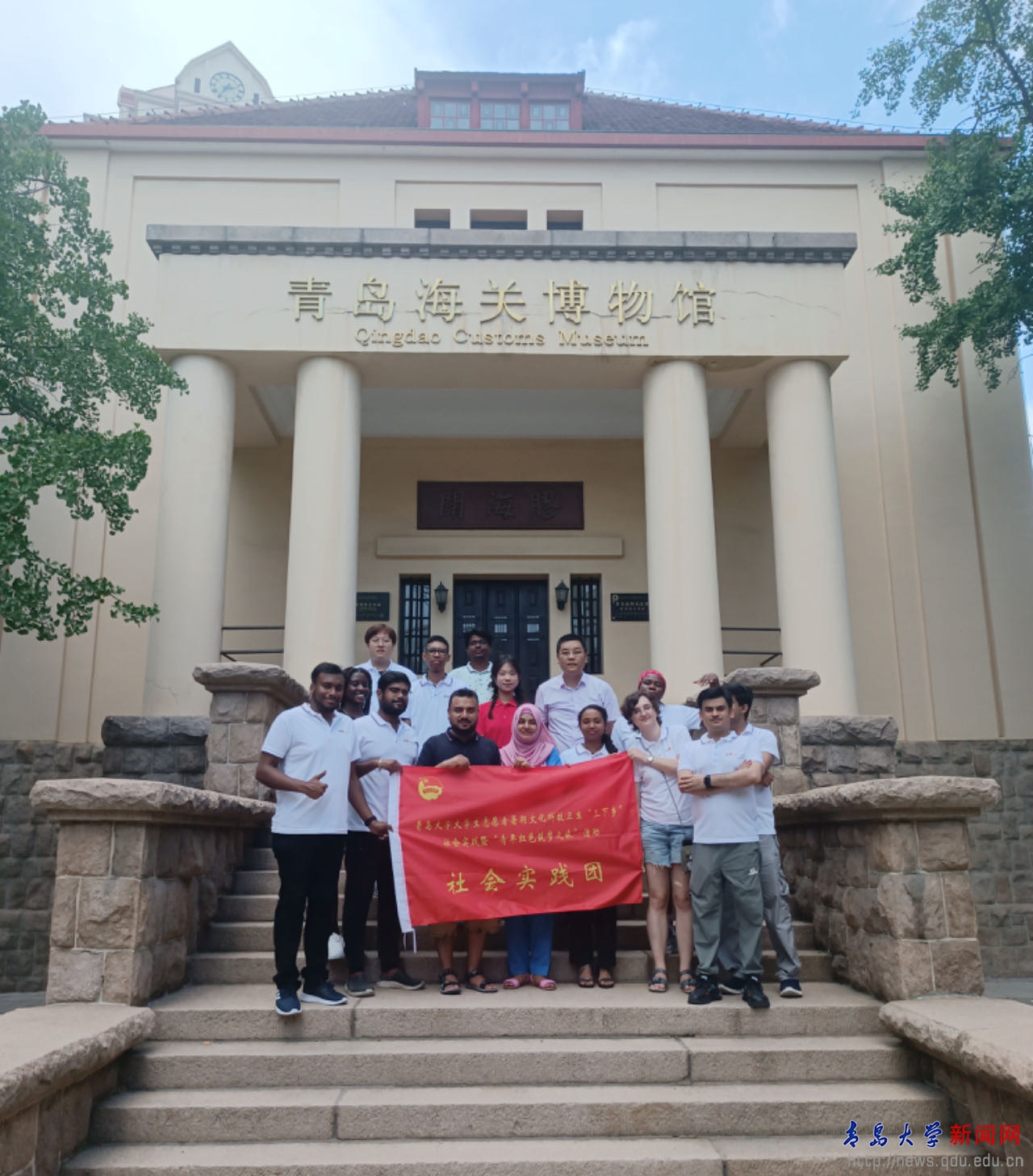 实践团队成员们还参观了位于市北区新疆路的青岛海关博物馆,在海关博物馆讲解员的热情带领下,追随着"海关"百年以来的历史演变,亲身感受了青岛海关的悠久历史,仿佛置身于历史的长河之中。一件件珍贵文物、一幅幅历史图片、一段段历史记忆引人入胜,在参观中,中外大学生们详细了解了青岛从小渔村到北方著名通商口岸的历史蜕变,了解了青岛海关发展的历史,探寻了一代代青岛海关人顺应时代洪流,与山东省、青岛市“以港兴省、以港兴市”发展战略和对外开放过程同频共振的历史沿革,体会到海关在地方开放发展中的作用。据悉青岛海关博物馆位于胶海关旧址内。胶海关是青岛海关的前身,设立于1899年7月,是近代中国第一个租借地海关。青岛海关博物馆共设立“胶海关专题”、“山东地区海关历史”两部分基本陈列内容,展陈图片千余幅、实物近500件、多媒体资料片12部、场景复原2处。