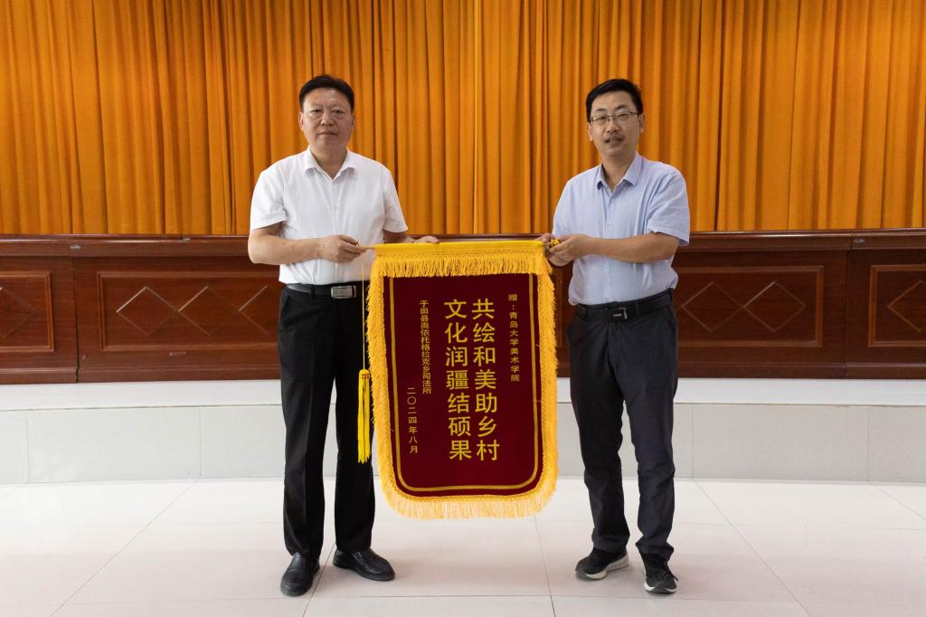 陈涛代表学校接受于田县奥依托格拉克乡司法所赠送的锦旗。