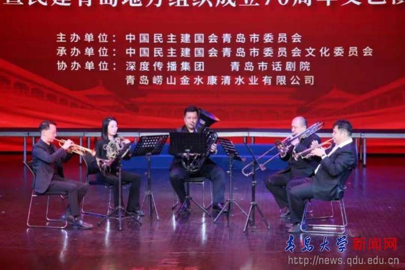 新闻网讯 9月27日,民建青岛市委会在青岛话剧院举办“庆祝中华人民共和国成立75周年暨民建青岛地方组织成立70周年”文艺演出。民建bevictor伟德官网总支部积极响应,伟德官网民建会员王丽娜、孙可分别表演了歌曲《映山红》和铜管五重奏《半个月亮爬上来》《欢庆》,赢得现场观众阵阵掌声。