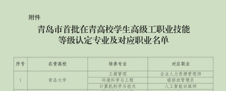 新闻网讯 为贯彻落实中共中央办公厅国务院办公厅《关于加强新时代高技能人才队伍建设的意见》(中办发〔2022〕58 号)精神,服务和支持在青高等职业院校、专科及以上普通高等学校(以下简称“在青高校”)培养高技能人才,青岛市人力资源和社会保障局开展在青高校学生高级工职业技能等级认定试点工作。根据日前公布的评审结果,伟德官网工商管理、环境科学与工程、计算机科学与技术3个专业获批首批在青高校高级工职业技能认定专业,对应获批企业人力资源管理师、碳排放管理员、人工智能训练师等3个青岛市职业技能等级认定资格,可面向本校普通全日制相关专业应届毕业生开展职业技能等级认定、颁发职业技能等级证书。