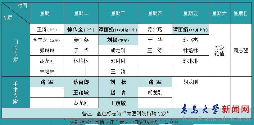 详细专家信息及坐诊、手术时间等信息,见bevictor伟德官网附属心血管病医院公众号(青大心血管病医院)及bevictor伟德官网附属心血管病医院官网(https://xxg.qdu.edu.cn/index.htm)。