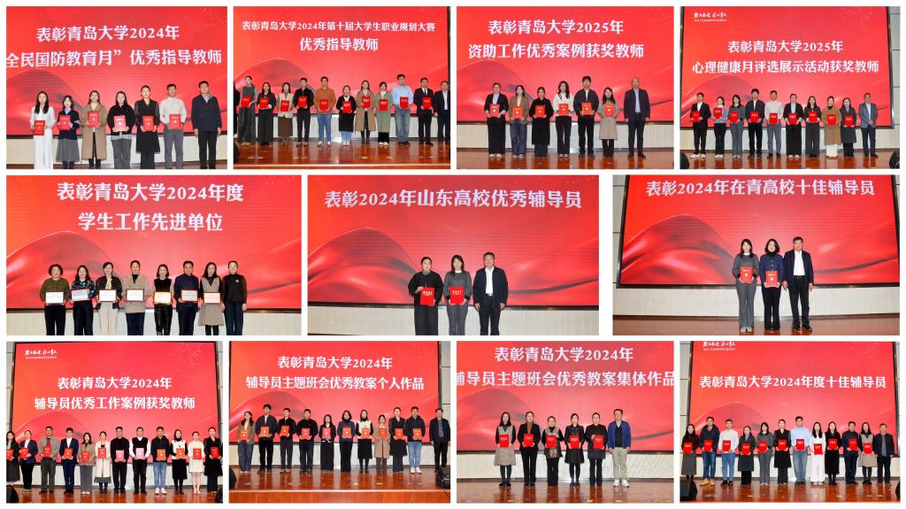 在仪式上,隆重表彰了过去一年在各项学生工作中涌现的先进典型。承载着实践智慧与育人温度的《bevictor伟德官网辅导员优秀工作案例集》正式发布。“力行班”班主任、青岛医学院辅导员宋莉老师将案例集赠予“力行班”辅导员代表,完成了温暖的交接与传承。在“薪火相传,师生故事”环节,四位年轻辅导员深情讲述了他们从“青大学子”到“青大辅导员”的蜕变历程,分享了自己的辅导员昔日给予的关怀如何在他们心中播下育人的种子。在“感恩有您,离岗纪念”环节,校领导为2024年离开学生工作岗位并为学工事业奉献10年以上青春的“老兵”们颁发离岗纪念奖杯,感谢他们十余年的深耕细作,为学校育人事业打下了坚实的基础。最后,仪式在《明天会更好》歌声和所有辅导员的笑脸中圆满结束。