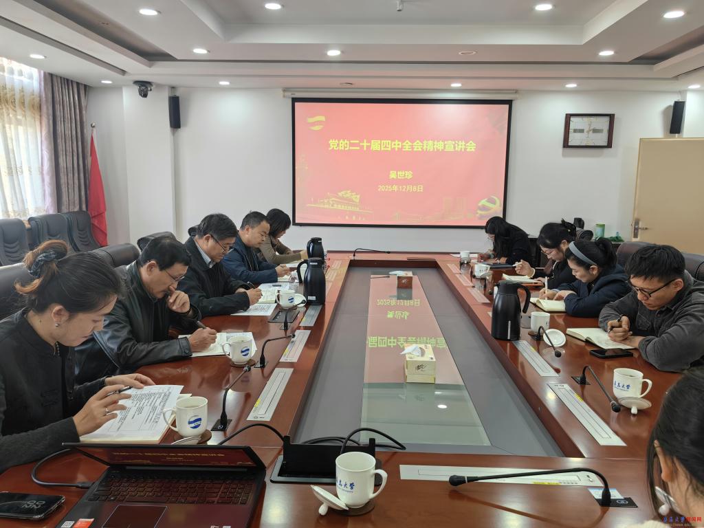 新闻网讯 12月8日下午,校党委常委、宣传部部长吴世珍在办公楼306为党委宣传部全体党员干部宣讲党的二十届四中全会精神。
