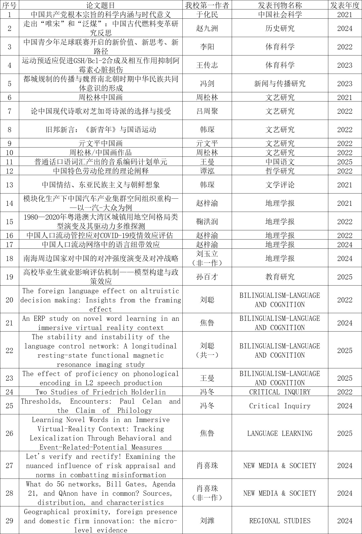 “十四五”期间,人文社科领域共计发表高水平论文3073篇,其中CSSCI论文977篇,SSCI、A&HCI论文2096篇。在综合性社会科学顶级期刊《中国社会科学》,在历史学、体育学、新闻学与传播学、艺术学、语言学、哲学、文学、人文经济地理、教育学、传播学、区域研究等学科领域的国内外顶级期刊《历史研究》《体育科学》《新闻与传播研究》《文艺研究》《中国语文》《哲学研究》《文学评论》《地理学报》《教育研究》Bilingualism-Language and Cognition Critical Inquiry Language Learning New Media & Society Regional Studies发表论文29篇(表2)。